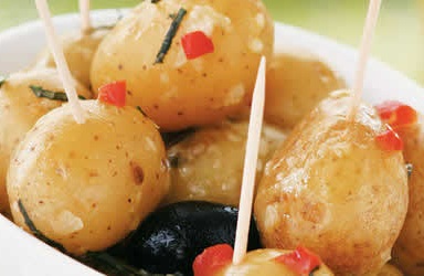 Ingredientes 1 xícara de azeite extravirgem 2 dentes de alho esmagados 1 colher (chá) de pimenta-caiena 1,5 kg de batata-bolinha 1 cebola média cortada em rodelas bem finas 1 xícara de suco de tangerina 10 gomos de tangerina sem a pele 1/2 xícara...