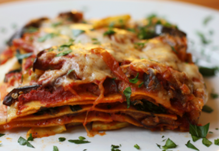 Pegue uma forma para a lasanha, coloque um pouco de óleo no fundo e depois cubra-o com massa para lasanha. Adicione 3/4 de xícara de molho de tomate quente e adicione a mistura de abóbora e berinjela, por cima coloque um pouco de mussarela. Repita o processo com o espinafre, e depois com os cogumelos.